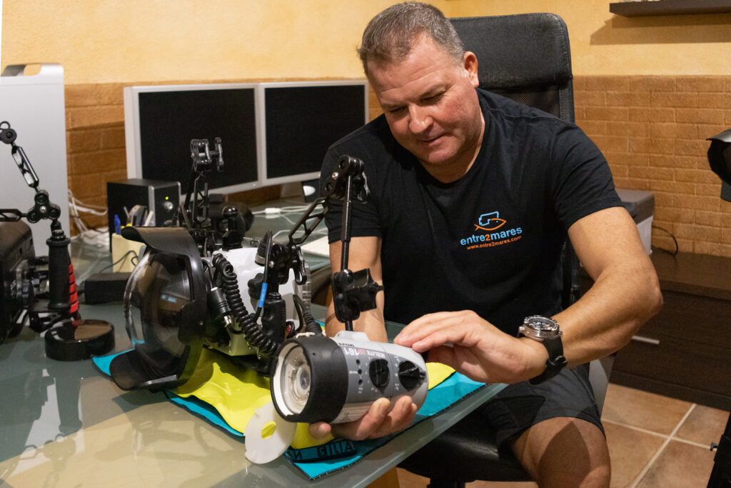 PACO VICIANA: Yo había trabajado durante 23 años en el taller de imagen de la Universidad de Alicante grabando y montando piezas de vídeo relacionadas con el ámbito marino. Por otro lado, como biólogo, me dedicaba a hacer informes medioambientales. Diana, por su parte, trabaja en una agencia de comunicación. En un momento decidimos unir nuestros campos de trabajo y ahí es donde surge Entre2mares. Lo que hacemos es grabar imágenes subacuáticas que ilustran los informes medioambientales. Además, también producimos documentales y vídeos.